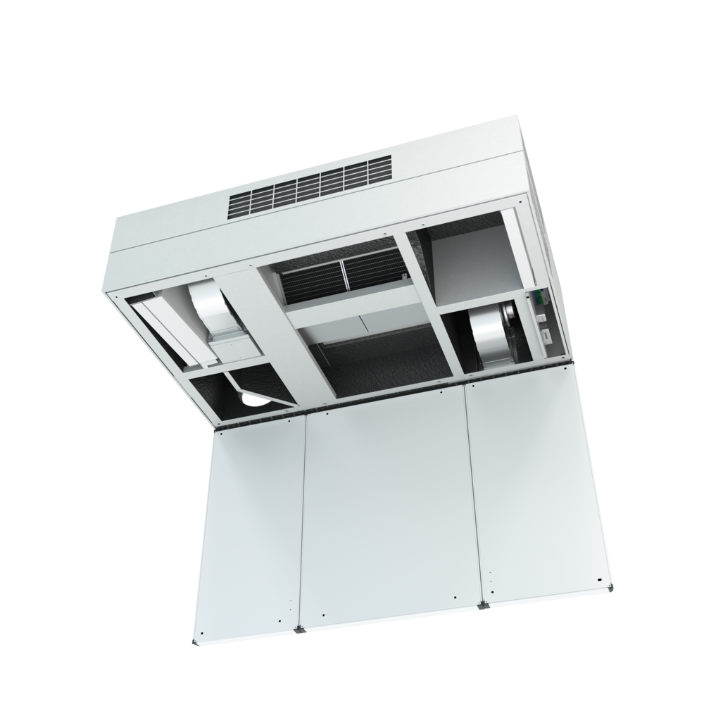 HALVINTEGRERAT MONTAGE DEX3000 kan ävan beställas i version avsedd för montering delvis integrerad i undertaket, medan den nedre delen där tilluften kommer ut blir synlig. På så sätt uppnås en diskret och kompakt installation som inte reducerar takhöjden särskilt mycket.